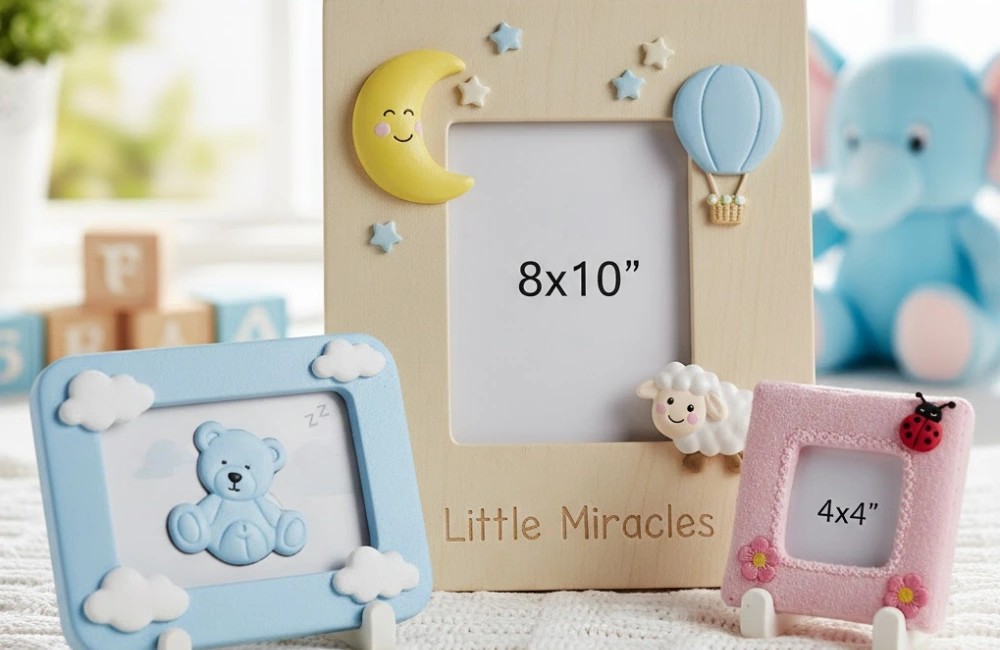 Baby photo frames are manufactured with safety, softness, and durability as top priorities. Materials include smooth-finished wood, MDF with child-safe coatings, food-grade silicone accents, acrylic panels, and lightweight resin. All surfaces are polished to remove sharp edges. Non-toxic paints, water-based finishes, and shatter-resistant glazing are used where required. Material selection balances safety compliance, visual appeal, and cost efficiency, making our frames suitable for baby gift brands, maternity retailers, and promotional programs.